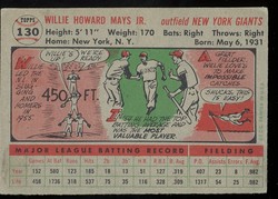 1956 Topps Baseball Card (#130 - Grey Back) of New York Giants Hall-of-Fame Outfielder, Willie Mays. Card is VG-EX with some corner wear and a surface crease along the top edge. No writing, pin holes, tape stains. See scan for centering.