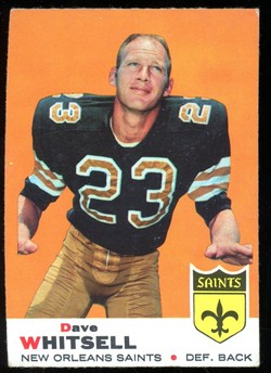 1969 Topps Football Card (#14) of former New Orleans Saints Defensive Back, Dave Whitsell. Card is EX with some corner wear/dings and no creases. No writing, pin holes, tape stains. See scan for centering.