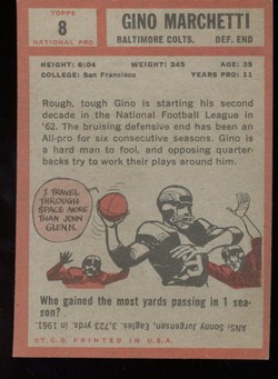 1962 Topps Football Card (#8) of Baltimore Colts Hall-of-Fame Defensive End, Gino Marchetti.