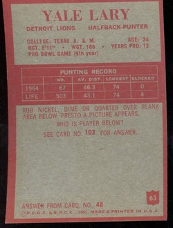 1965 Philadelphia Gum Co. Football Card (#63) of Detroit Lions Hall-of-Fame Defensive Back, Yale Lary.