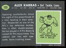 1969 Topps Football Card (#123) of former Detroit Lions Star Defensive Tackle, Alex Karras. Card is EX-MT with some light corner wear and no creases. No writing, pin holes, tape stains. corner. See scan for centering.