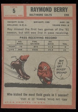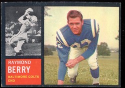 1962 Topps Football Short Print Card (#5) of Baltimore Colts Hall-of-Fame Wide Receiver, Raymond Berry.