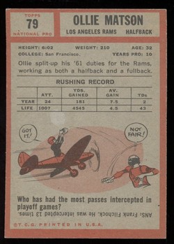 1962 Topps Football Short Print Card (#79) Of Los Angeles Rams Hall-of-Fame Running Back, Ollie Matson.