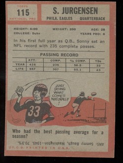 1962 Topps Football Card (#115) Of Philadelphia Eagles / Washington Redskins Hall-of-Fame Quarterback, Sonny Jurgensen.