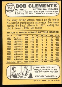 1968 Topps Baseball Card (#150) of Pittsburgh Pirates Hall-of-Fame Outfielder, Roberto Clemente.
