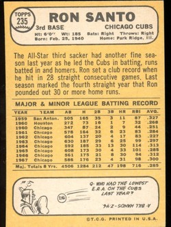 1968 Topps Baseball Card (#235) Featuring Former Chicago Cubs All-Star 3rd Baseman, Ron Santo.