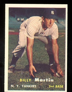1957 Topps Baseball Card (#62) of Former New York Yankees Infielder and Manager, Billy Martin. Card is EX+ with some corner wear and a small corner crease in the upper left. No writing, pin holes, tape stains. See scan for centering