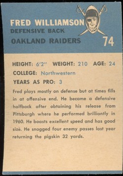 1962 Fleer Football Rookie Card (#74) of longtime actor and former Oakland Raiders Defensive Back, Fred Williamson.