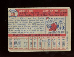 1957 Topps Baseball Card (#25) of New York Yankees Hall-of-Fame Pitcher, Whitey Ford. Card is VG with some corner wear/dings and a light surface crease. No writing, pin holes, tape stains. See scan for centering.