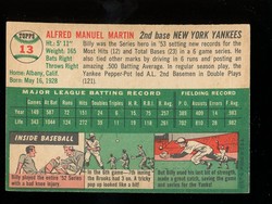 1954 Topps Baseball Card (#13) of Former New York Yankees Infielder, Billy Martin. Card is EX+ with some corner wear and no creases. No writing, pin holes, tape stains. Small ding in the lower left corner. See scan for centering.