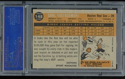 1960 Topps Baseball Rookie Card (#148) of Boston Red Sox Hall-of-Fame Outfielder, Carl Yastrzemski. Card is professionally graded 8 NM-MT (Near Mint to Mint) by PSA.