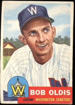 1953 Topps Baseball High Number Short Print Card (#262) of former Washington Senators Catcher, Bob Oldis. Card is VG-EX with some corner wear/dings and a light back crease. No writing, pin holes, tape stains. Rubber band bend on right edge. See scan for centering.