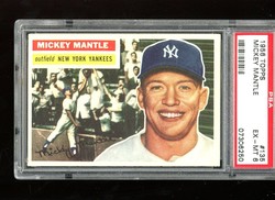 1956 Topps Baseball Card (#135) of New York Yankees Hall-of-Fame Outfielder, Mickey Mantle. Card is professionally graded 6 EX-MT (Excellent to Mint) by PSA.