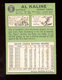 1967 Topps Baseball Card (#30) of Detroit Tigers Hall-of-Fame Outfielder, Al Kaline. Card is EX+ with some corner wear and no creases. No writing, pin holes, tape stains. See scan for centering.