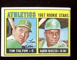 1967 Topps Baseball High Number Short Print Kansas City A's Rookie Stars Card (#603) featuring Tim Talton and Ramon Webster. Card is EX with some corner wear/dings and no creases. No pin holes, tape stains. See scan for centering.