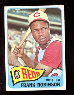 1965 Topps Baseball Card (#120) of Cincinnati Reds / Baltimore Orioles Hall-of-Fame Outfielder, Frank Robinson. Card is EX+ with some corner wear and no creases. No writing, pin holes, tape stains. Small rubber band bend on right edge. See scan for centering.