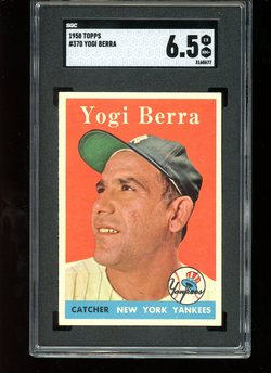 1958 Topps Baseball Card (#370) of New York Yankees Hall-of-Fame Catcher, Yogi Berra. Card is professionally graded 6.5 EX-MT+ (Excellent to MINT Plus) by SGC.