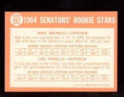 1964 Topps Baseball Washington Senators Rookie Stars Card (#167) Featuring Mike Brumley and Lou Piniella. Card is NM with some light corner wear and no creases. No writing, pin holes, tape stains. See scan for centering.