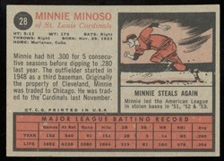 1962 Topps Baseball Card (#28) of Former St Louis Cardinals / Chicago White Sox Star Outfielder, Minnie Minoso. Card is EX+ with some corner wear and no creases. No writing, pin holes, tape stains. Small ding in the lower right corner. See scan for centering.