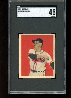 1949 Bowman Baseball Card (#27) of Cleveland Indians Hall-of-Fame Pitcher, Bob Feller. Card is professionally graded 4 VG-EX (Very Good to Excellent) by SGC.