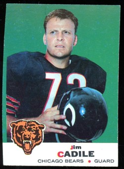 1969 Topps Football Card (#3) of former Chicago Bears Guard, Jim Cadile. Card is EX-MT with some corner wear and no creases. No writing, pin holes, tape stains. See scan for centering.