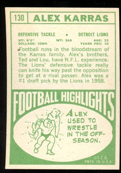 1968 Topps Football Card (#130) of former Detroit Lions Defensive Tackle, Alex Karras.