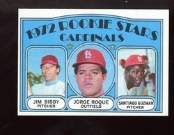 1972 Topps Baseball St Louis Cardinals Rookie Stars Card (#316) featuring Jim Bibby, Jorge Roque and Santiago Guzman. Card is EX-MT+ with some light corner wear and no creases. No writing, pin holes, tape stains. Slight ding in upper right corner. See scan for centering.