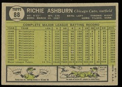 1961 Topps Baseball Card (#88) of Chicago Cubs / Philadelphia Phillies Hall-of-Fame Outfielder, Richie Ashburn. Card is EX+ with some corner wear and no creases. No writing, pin holes, tape stains. See scan for centering.