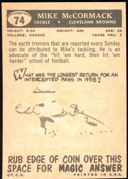 1959 Topps Football Card (#74) of Cleveland Browns Hall-of-Fame Tackle, Mike McCormick. Card is EX-MT with some corner wear and no creases. No writing, pin holes, tape stains. See scan for centering.