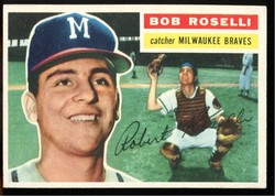 1956 Topps Baseball Card (#131 - Grey Back) of former Milwaukee Braves Catcher, Bob Roselli. Card is EX-MT with some corner wear and no creases. No writing, pin holes, tape stains. Small ding in the lower left corner. See scan for centering.
