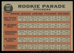 1962 Topps Baseball Rookie Parade High Number Short Print Rookie Card (#592) of former New York Yankees Pitcher, Jim Bouton. Also features Dan Pfister (A's), Dave Stenhouse (Senators), Joe Bonikowski (Twins) and Bo Belinsky (Angels)