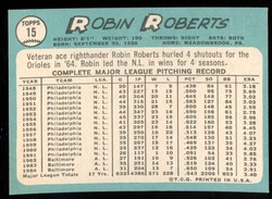 1965 Topps Baseball Card (#15) featuring Baltimore Orioles / Philadelphia Phillies Hall-of-Fame Pitcher, Robin Roberts. Card is EX-MT with some corner wear and no creases. No writing, pin holes, tape stains. Small ding in the lower left corner. See scan for centering.