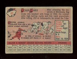 1958 Topps Baseball Rookie Card (#47) of former Cleveland Indians / New York Yankees Star Outfielder, Roger Maris. Card is VG with some corner wear and corner creases. No writing, pin holes, tape stains. See scan for centering