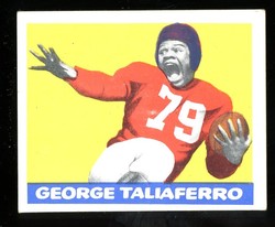 1948 Leaf Football Rookie Card (#20 - Yellow Background) of former Dallas Texans Running Back, George Taliaferro. Card is EX+ with some corner wear and no creases. No writing, pin holes, writing. Small ding in the lower right corner. See scan for centering.