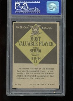 1961 Topps Baseball MVP Card (#472) of New York Yankees Hall-of-Fame Catcher, Yogi Berra. Card is graded 8 NM-MT (Near Mint to Mint) by PSA.