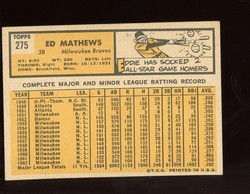 1963 Topps Baseball #275 Ed Mathews Milwaukee Braves HOF