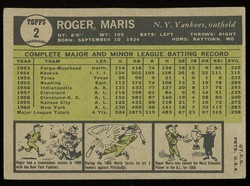 1961 Topps Baseball Card (#2) of former New York Yankees All-Star Outfielder, Roger Maris. Card is EX with some corner wear/dings and a light corner crease in the upper left. No writing, pin holes, tape stains. See scan for centering.