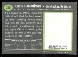 1969 Topps Football Card (#248) of Washington Redskins Hall-of-Fame Linebacker, Chris Hanburger. Card is EX-MT with some corner wear and no creases. No writing, pin holes, tape stains. See scan for centering.