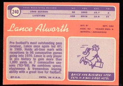 1970 Topps Football Card (#240) of San Diego Chargers Hall-of-Fame Wide Receiver, Lance Alworth. Card is EX-MT with some light corner wear and no creases. No writing, pin holes, tape stains. See scan for centering.