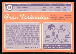 1970 Topps Football Card (#80) of New York Giants / Minnesota Vikings Hall-of-Fame Quarterback, Fran Tarkenton. Card is EX+ with some corner wear and no creases. No writing, pin holes, tape stains. See scan for centering.