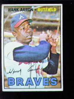 1967 Topps Baseball Card (#250) of Atlanta Braves Hall-of-Fame Outfielder, Hank Aaron. Card is EX- with some corner wear and no creases. No writing, pin holes, tape stains. See scan for centering.