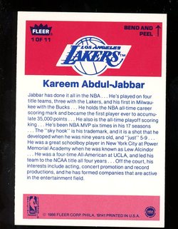 1986 - 1987 Fleer Basketball Sticker Card (#1) of Los Angeles Lakers Hall-of-Fame Center, Kareem Abdul Jabbar. Card is EX-MT with some light corner wear and no creases. No writing, pin holes, tape stains. SLight surface indentation in the lower left. See scan for centering.