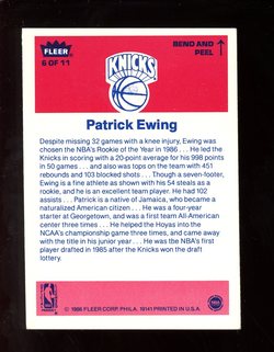 1986 - 1987 Fleer Basketball Sticker Card (#6) of New York Knicks Hall-of-Fame Center, Patrick Ewing. Card is EX-MT with some corner wear and no creases. No writing, pin holes, tape stains. Small ding in the upper left corner. See scan for centering.