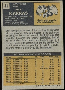 1971 Topps Football Card (#41) of Detroit Lions Star Defensive Tackle, Alex Karras. Card is EX-MT with some corner wear and no creases. No writing, pin holes, tape stains. Small ding in the upper left corner. See scan for centering.