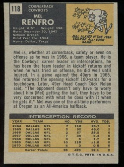 1971 Topps Football Card (#118) of Dallas Cowboys Hall-of-Fame Cornerback, Mel Renfro. Card is EX-MT with some corner wear and no creases. No writing, pin holes, tape stains. Small ding in the lower left corner. See scan for centering.