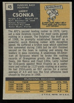 1971 Topps Football Card (#45) of Miami Dolphins Hall-of-Fame Running Back, Lary Csonka. Card is EX-MT with some corner wear and no creases. No writing, pin holes, tape stains. See scan for centering.