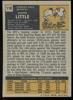 1971 Topps Football Card (#110) of Denver Broncos Hall-of-Fame Running Back, Floyd Little. Card is EX-MT with some corner wear and no creases. No writing, pin holes, tape stains. See scan for centering.