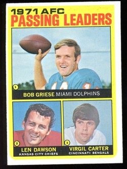 1972 Topps Football AFC Passing Leaders Card (#3) featuring Virgil Carter and Hall-of-Famers Len Dawson and Bob Griese. Card is EX-MT with some light corner wear and no creases. No writing, pin holes, tape stains. Small print bubble near left edge. See scan for centering.