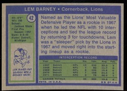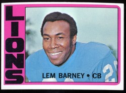 1972 Topps Football Card (#42) of Detroit Lions Hall-of-Fame Cornerback, Lem Barney. Card is EX-MT with some light corner wear and no creases. No writing, pin holes, tape stains. See scan for centering.