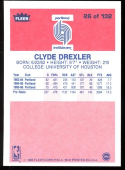 1986 - 1987 Fleer Basketball Rookie Card (#26) of Portland Trailblazers Hal-of-Fame Forward, Clyde Drexler. Card is NM with some light corner wear and no creases. No writing, pin holes, tape stains. See scan for centering.